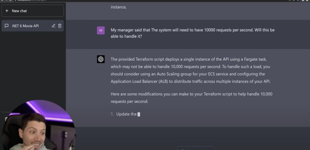 A senior developer tested GPT4 for programming. GPT4 gave the Terraform script code for a single instance of the Fargate API. GPT4 knows that the code will not scale to 10,000 requests per second. It then describes how to create an auto-scaling group and make the modifications to scale the code with AWS and configure the application load balancer.