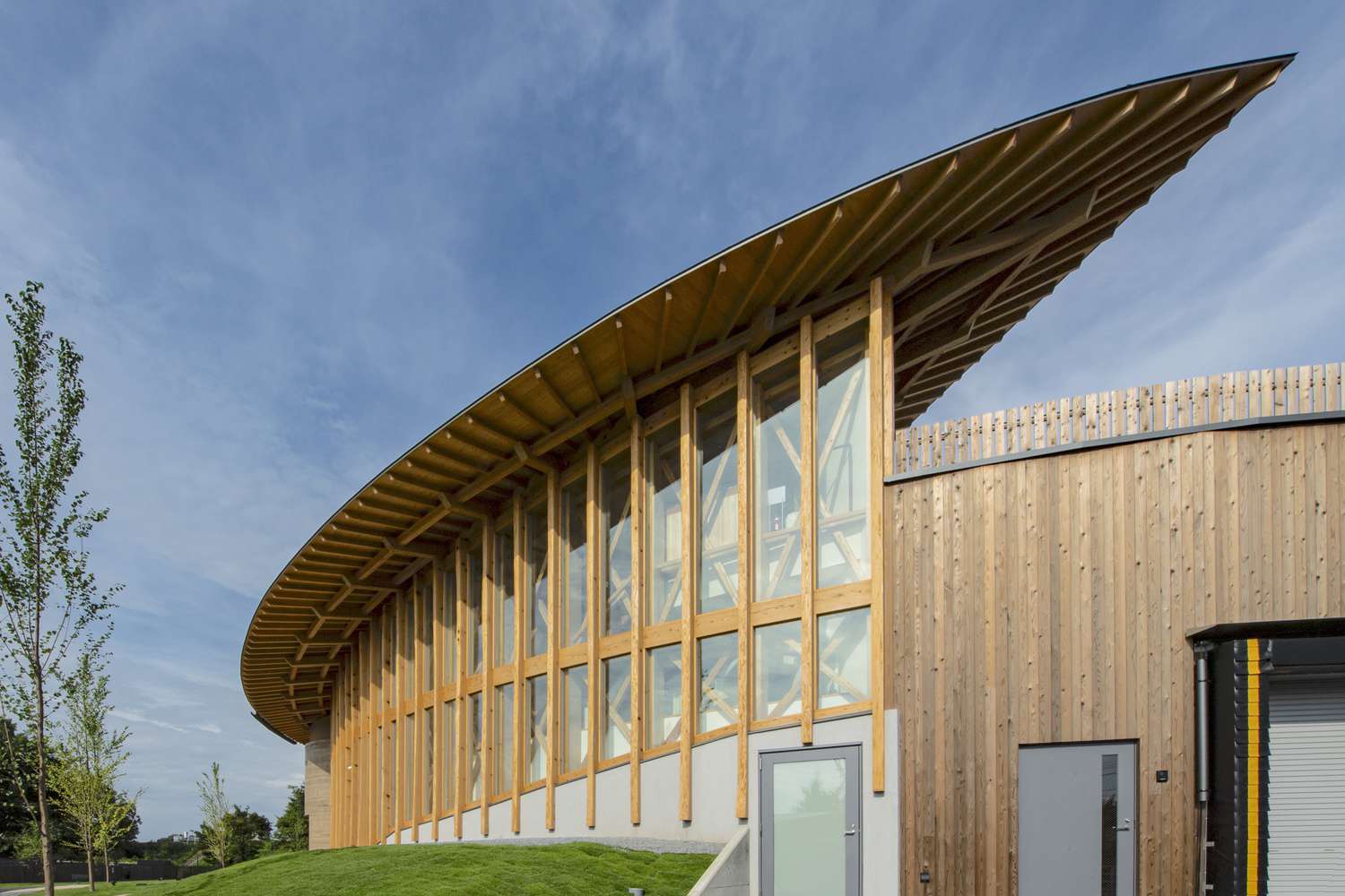 The architects explain that the arc of the roof echoes the mountains in the distance, with the roof beams being meticulously hand-chiseled by local craftspeople. Both of the end corners of the curved roof employ a traditional configuration of rafters that fan out, creating a dramatic roofline that mediates between earth and sky.
