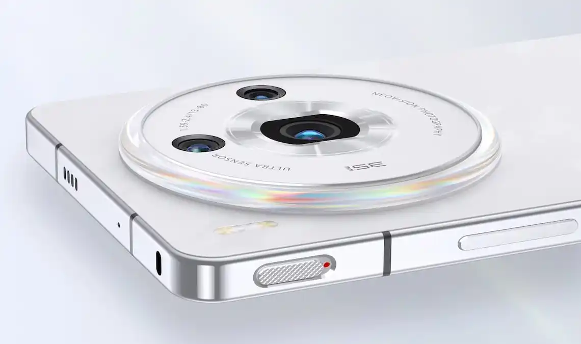 It dominates the upper half of a pale silver-white rear panel finished in a “nano-scale coating” to evince a “frost rock” effect. The Neovision Photography-branded cameras of this SKU – reportedly dubbed “Pick Up the Light” – are encircled with a solid “rainbow holographic“-effect ring, which might make some Nubia fans wonder what happened to the one with the multiple milled fullers in red on a black background from earlier teasers.