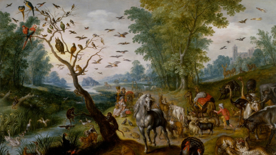 Perhaps the most glorious art work in the exhibition is the epic “Noah’s Family Assembling the Animals Before the Ark,” painted around 1660 by the Flemish artist Jan van Kessell the Elder. The Noahs—dressed in their Flemish finest—herd a zoofull of animals across a distinctively Northern European landscape toward a distant, barely-visible boat. Camels, turtles, monkeys, ostriches—even North American turkeys—ramble across the frame. But it’s the sky that commands our attention: A riot of birds, two-by-two, winging their way to safety.