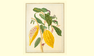 From roughly the 15th through the 19th centuries, most European botanical collectors and artists experienced the Americas through seeds and specimens painstakingly brought back from scientific voyages. But some traveled to encounter plants in their natural habitats. One such artist was Maria Sibylla Merian. Merian was born in Frankfurt, where her stepfather, the still-life artist Jacob Marrel, taught her to paint flowers in watercolor. Alongside this artistic education, Merian developed an enduring interest in entomology. Between 1679 and 1683, she published two volumes on the insect life cycle, the product of years of careful study.